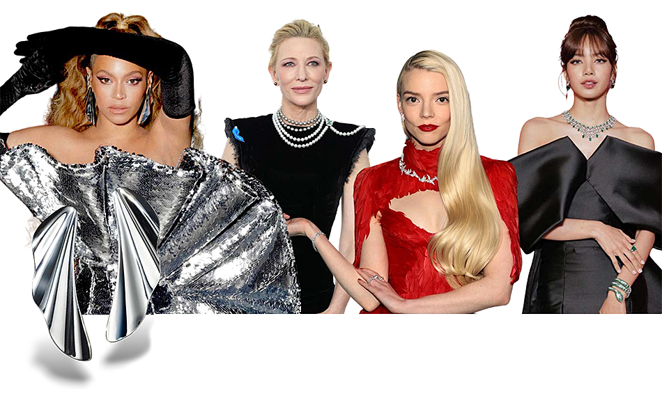 | L to R: Tiffany & Co x Beyoncé, Louis Vuitton x Cate Blanchett, Tiffany & Co x Anja Taylor Joy, Bulgari x Lisa, Blackpink |