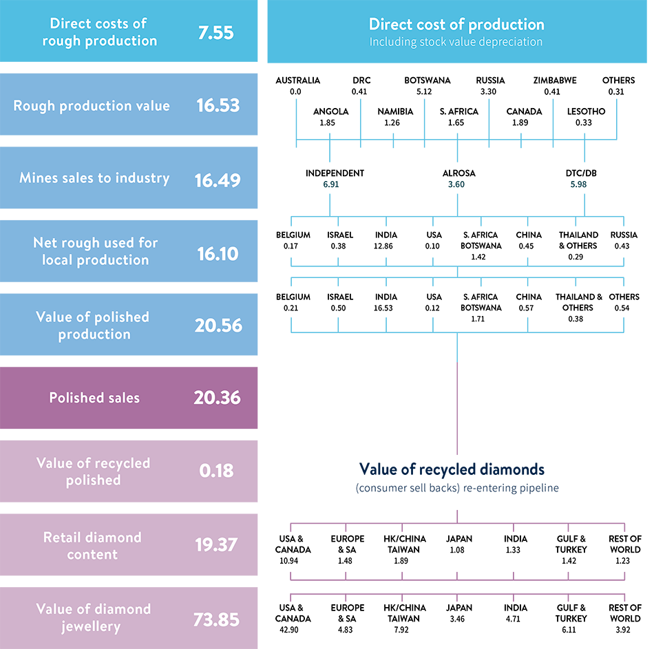 A five per cent decline in global natural diamond jewellery translates into a decrease in polished demand of 11 per cent - or about $US18.1 billion ($AU27 billion) in sales.