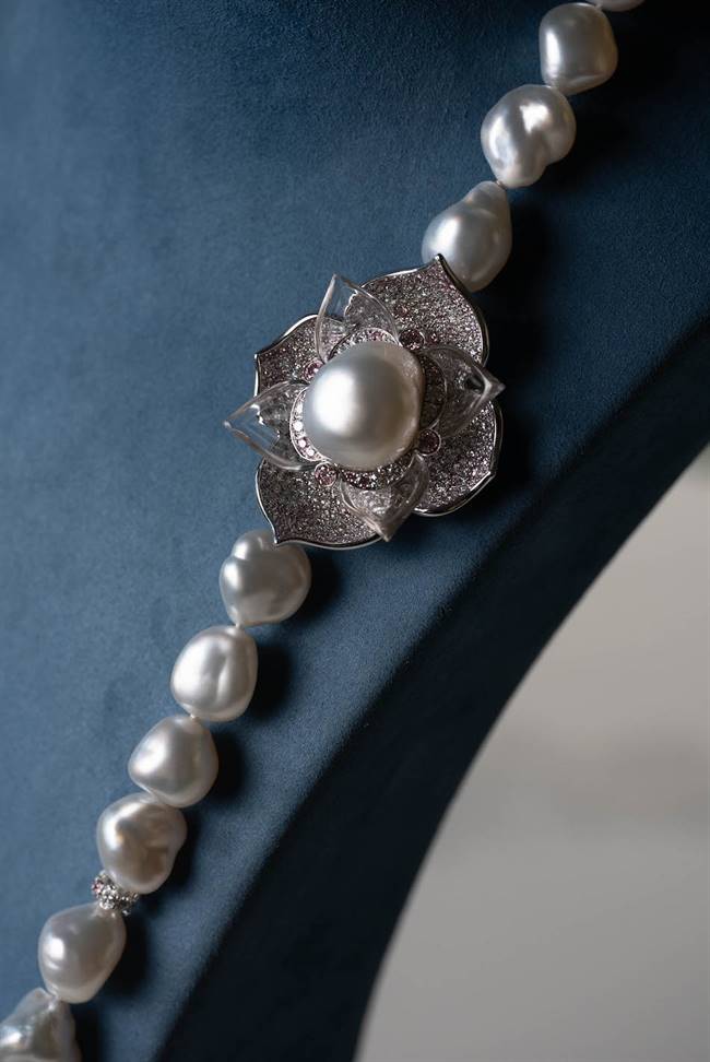 The Keshi pearl strand and individual Keshi in the diamond ‘lotus’ brooch were sourced from off the coast of Broome.