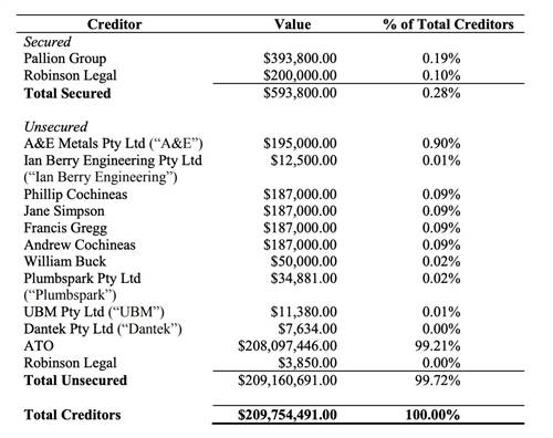 The total amount owed to unsecured creditors was $209,160,691 - 99.5 per cent of which was a GST debt to the ATO ($208 million).