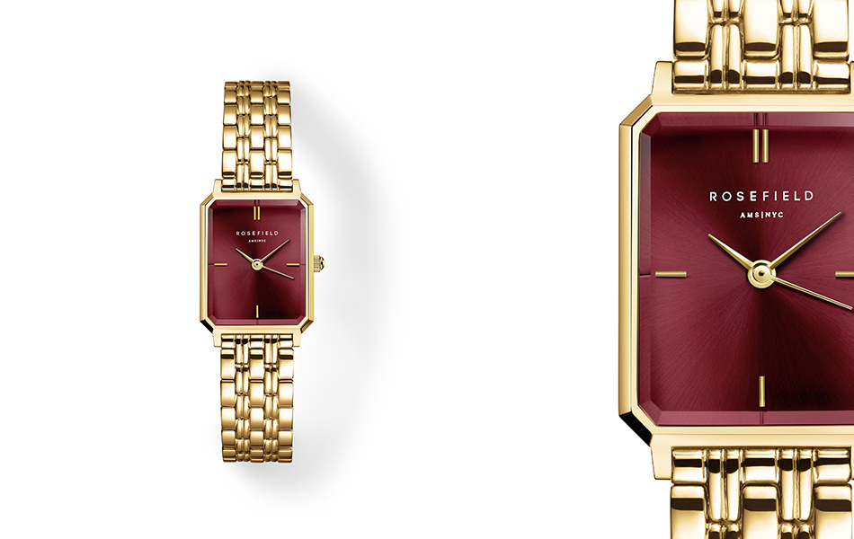 This rare octagonal face shape features a rich sunray burgundy dial that creates an ever-changing spectacle of light and colour and the elegant 5-link gold-tone bracelet evokes the sophistication of the 1920s.