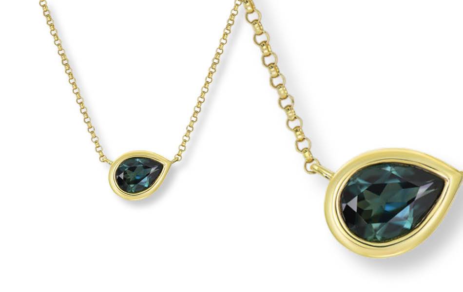Featuring a pear-cut Australian sapphire, it is set in a 9-carat yellow gold bezel and suspended from a fine chain for a sleek, contemporary look. More information: Sams Group Australia VIEW SHOW & TELL