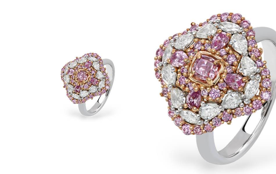 This one-of-a-kind floral-inspired creation blooms with a halo of vibrant pink diamonds and a stunning arrangement of white marquise and pear-cut diamonds, radiating elegance from every angle. More information: Sams Group Australia VIEW SHOW & TELL