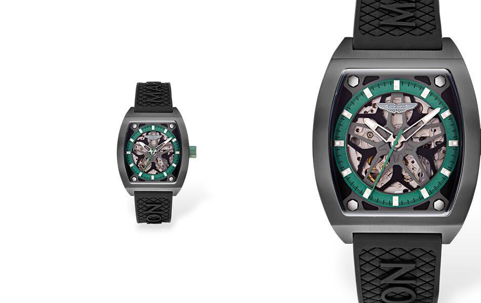 Its skeleton dial, inspired by DBS GT Zagato wheel rims, reveals the movement within, while a stitched black silicone strap echoes Aston Martin’s seats. Topped with sapphire-coated glass and a transparent case back showing the movement and a Podium Green rotor.