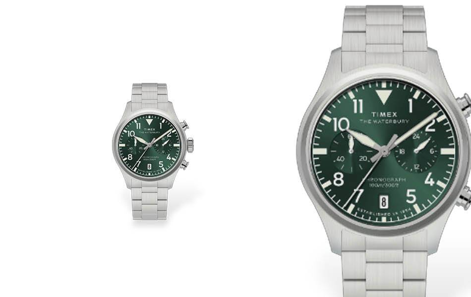 It's clean, high-contrast green sunray dial ensures quick time checks with bold Arabic numerals, and the second hand is unique as well: sleek and minimal. More information: Designa Accessories VIEW SHOW & TELL