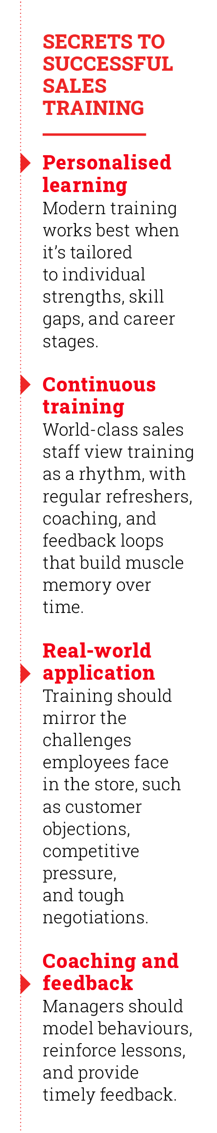 Emphasise real-world application: Training should mirror the challenges employees face in the store, such as customer objections, competitive pressure, and tough negotiations. Role-plays, call reviews, and scenario-based learning