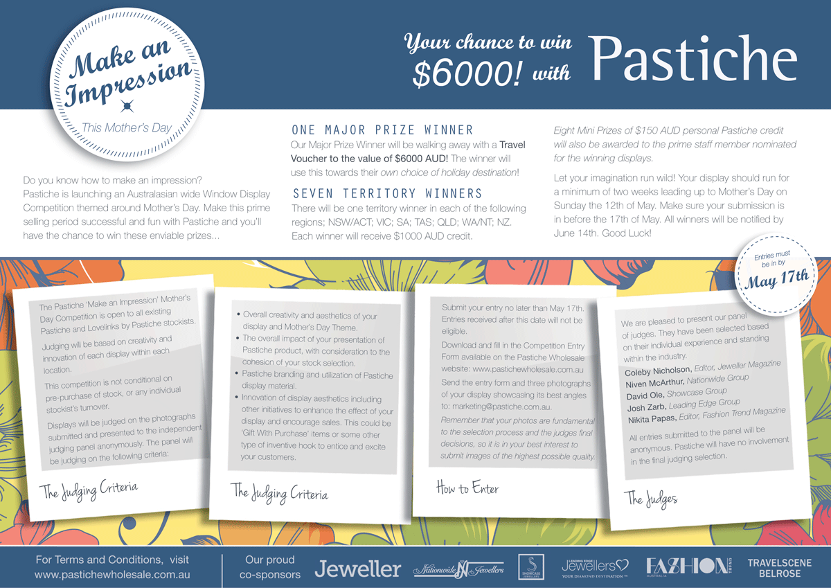 Entry forms and details are available at the Pastiche wholesale website, or click on the image below to view competition details.