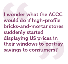 I wonder what the ACCC would do if high-profile bricks-and-mortar stores suddenly started displaying US prices in their windows to portray savings to consumers?