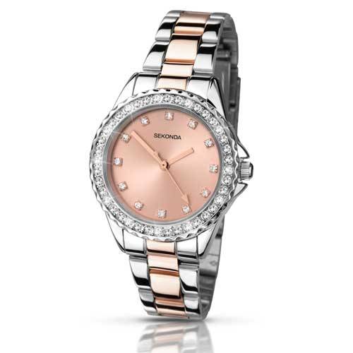 The timepiece featured is a two-tone women’s fashion watch that includes the highest-grade Japanese quartz movements. This piece comes with a two-year warranty.