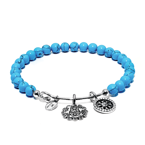 The Chrysalis Guardian collection incorporates semi-precious gemstones said to bring positivity and good energy into the wearer’s life. The range is available in regular and small sizes, with all bangles being rhodium-plated. The item pictured is called Turquoise Mother Doll, which “brings protection into your life”.