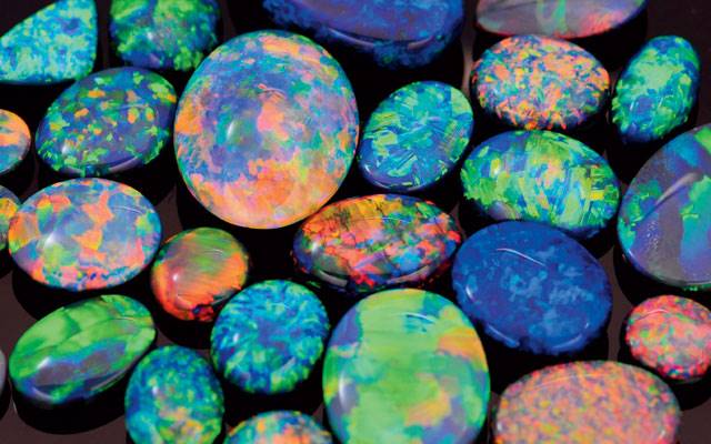 The most famous opals – blazing fireballs of colour set against black backgrounds – are typical of high-quality Lightning Ridge material from NSW, the home of the Australian black opal. According to Aboriginal legend, a huge wheel of fire fell to earth and sprayed the countryside with brilliant coloured stones.