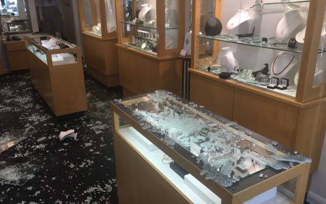 The theft took place at about 1:30pm and involved three masked thieves allegedly carrying machetes and sledgehammers as they smashed display cabinets and filled a bag with jewellery.