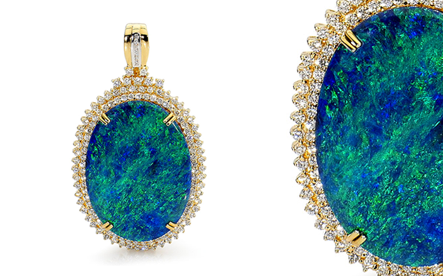 Opals Australia is showcasing its new range of Australian Black Opal at the IJF. Here is an Australian Black Opal 24.29-carat set in 18-carat yellow gold with 126 diamonds. More Information: Opals Australia’s full range