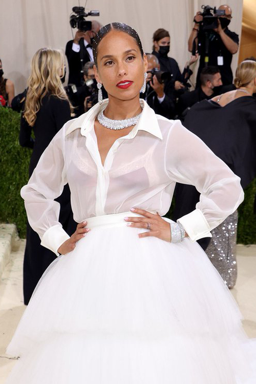 | Alicia Keys Van Cleef & Arpels Earrings: 'À Cheval' earrings, featuring diamonds set in platinum and 18-carat white gold Necklace: 'Rayons Blancs' necklace, featuring diamonds set in 18-carat white gold, from the from the Sous les Étoiles Collection Bracelets: 'À Cheval' bracelet, featuring diamonds set in platinum and 18-carat white gold; 'Perlée' cuff, featuring diamonds set in 18-carat white gold Valued at: Unknown |  |