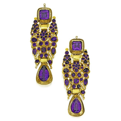 | Mindy Kaling Antique Earrings: Antique 18th Century earrings, featuring amethysts set in yellow gold Valued at: Unknown |  |