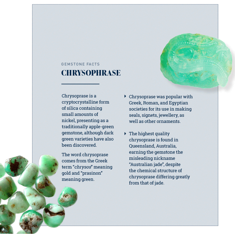 Chrysoprase jewellery can be worn daily and maintained using an ultrasonic jewellery cleaner or with warm, soapy water and a soft brush. The gemstone’s vibrant hue can fade in the sunlight over time due to dehydration, which deprives the gemstone of its colouring agent. The gemstone can lose its lustre when it dries but can be restored by soaking in water.