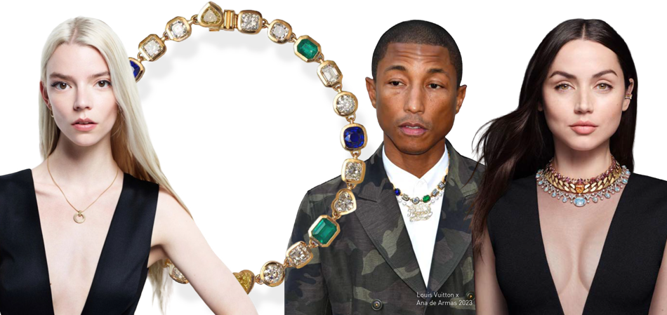 | L to R: Tiffany & Co x Anja Taylor-Joy 2023, Jacob & Co. x Pharrell, Louis Vuitton x Ana de Armas 2023 |