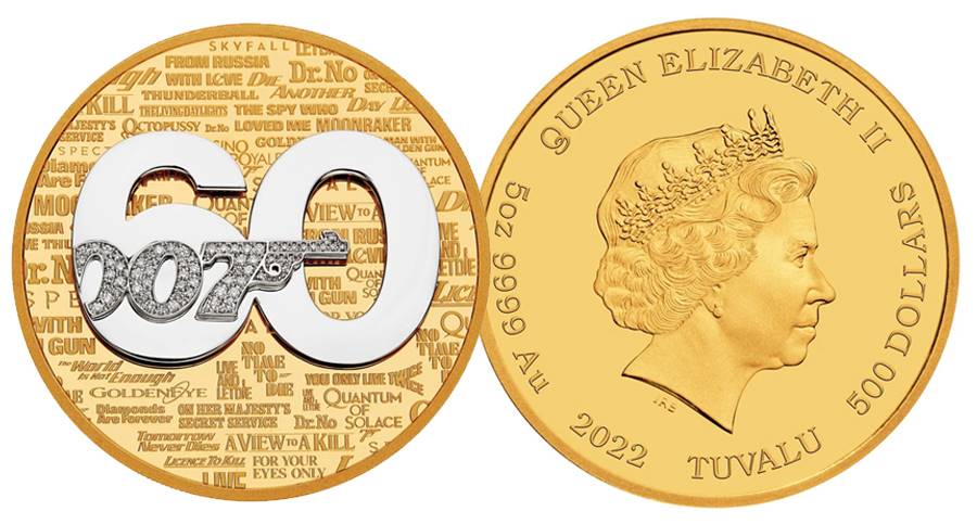 The 60th Years of Bond 2022 coins are officially licensed and made of 5 oz of 99.99% gold with white gold accents, pavé set white diamond logo.