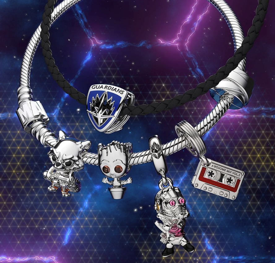 The Marvel x Pandora collection features five charms and one ring with characters such as Star-Lord, Groot, and Rocket crafted in hand-finished sterling silver.