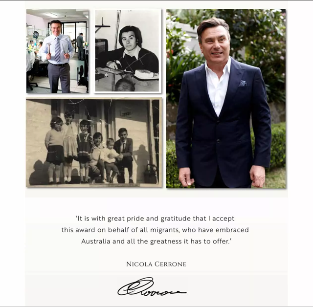 Cerrone was awarded the honour by Governor General David Hurley in a ceremony on 18 April, acknowledged for his contribution to Australia’s arts, manufacturing and business sectors. | Source: Cerrone