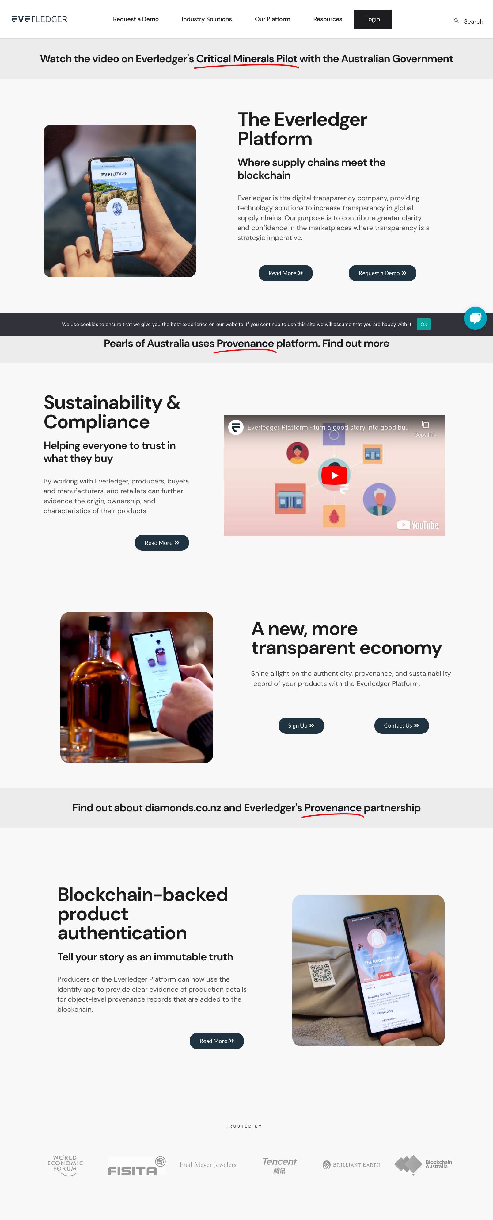 A website screen capture 27 June, showing the logos and implication that Everledger is “trusted by” the World Economic Forum and Blockchain Australia; both organisations deny any knowledge of the claims and advise no permission was granted for use of their logos.