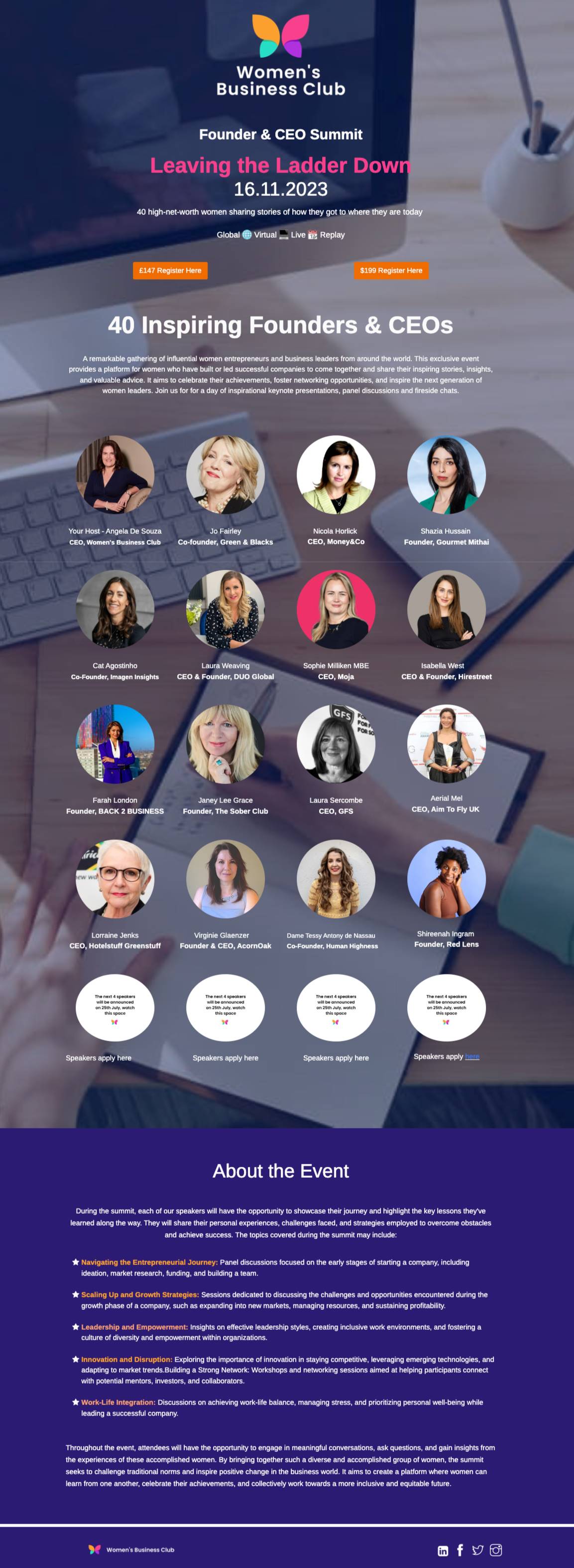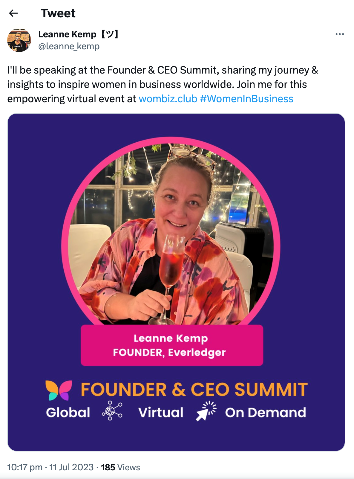 On 11 July, just one day before a resolution to liquidate Everledger, Leanne Kemp began advertising herself as a speaker at the ‘Founder and CEO Summit’ hosted by Women’s Business Club. Even though organisers have since cancelled her appearance Kemp’s Twitter account still promotes her attendance.