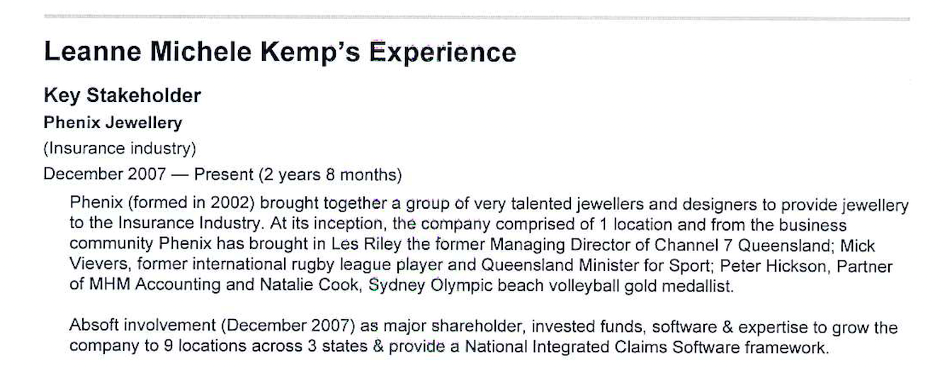Kemp's ownership or, and senior management position at Phenix Jewellery originally appeared on Linkedin; however, her current - and highly detailed - profile omits any mention of the company.