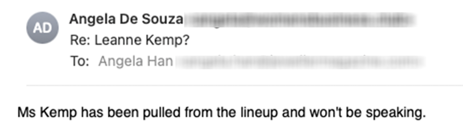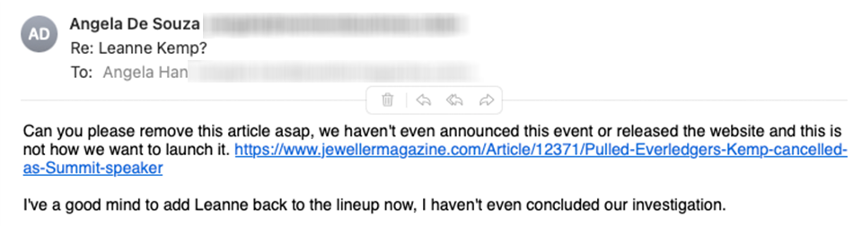 De Souza’s first advice (15 July) stating that Kemp had been pulled from the Summit and would not be speaking. Kemp’s removal had been done before Jeweller had even contacted De Souza.