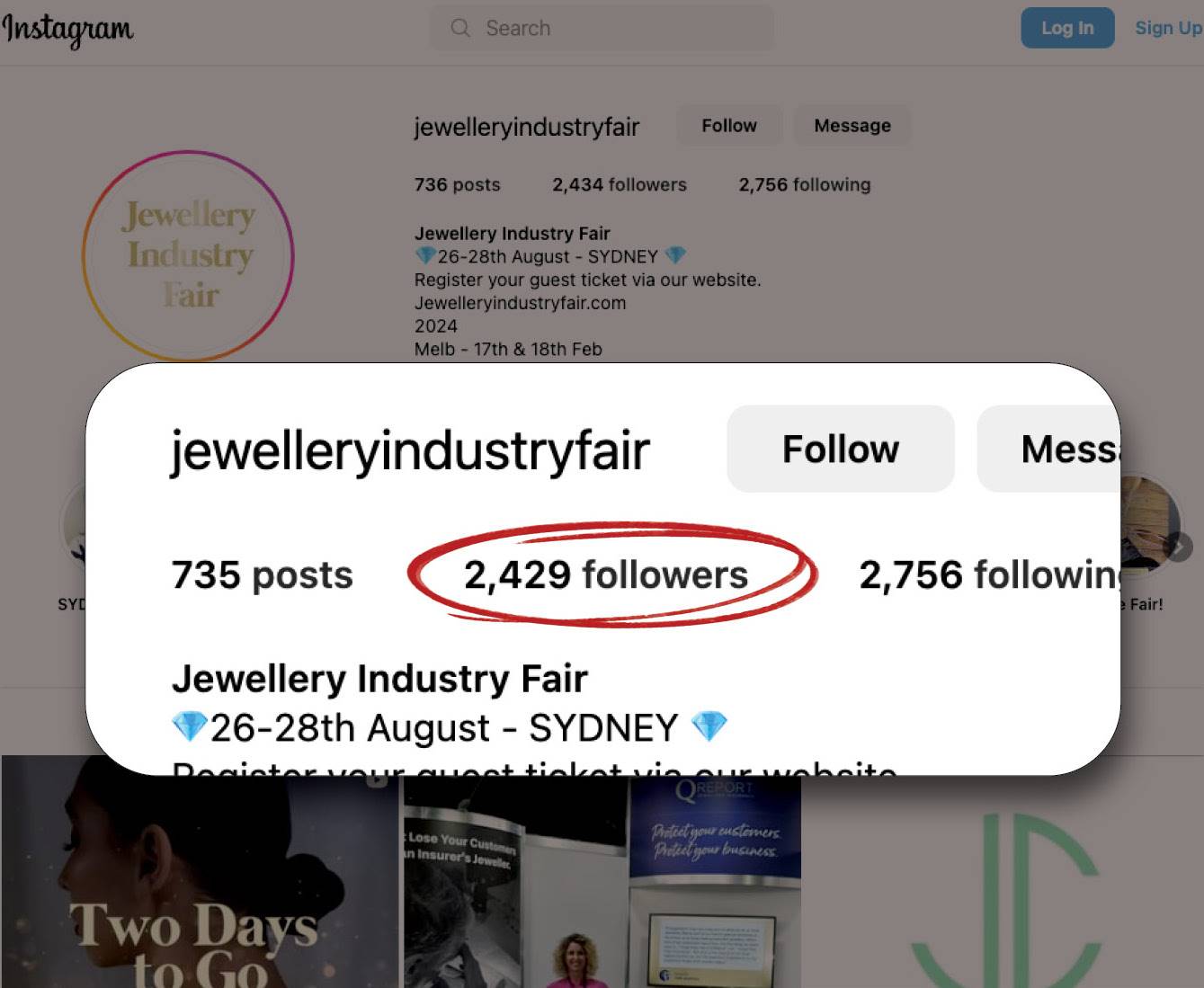 JIN’s misleading brochure which resulted in a 14-month legal dispute ending in the Federal Court. It clearly makes the claim that in May 2022 the Jewellery Industry Fair Instagram account had 6,776 followers - as of today it only has 2,429.
