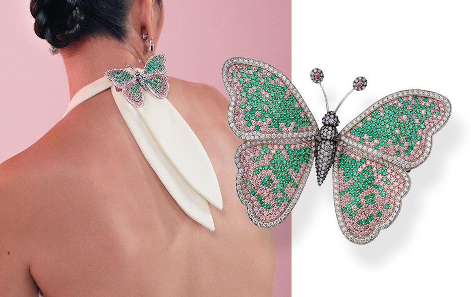 Mariposa 'Butterfly' Brooch:  4.53cts of precision-cut no-oil emeralds with 5.31cts of Argyle Pink and 1.26cts of violet/blue diamonds, surrounded by white diamonds. Crafted in 18-carat gold can also be transformed into a hair clip.
