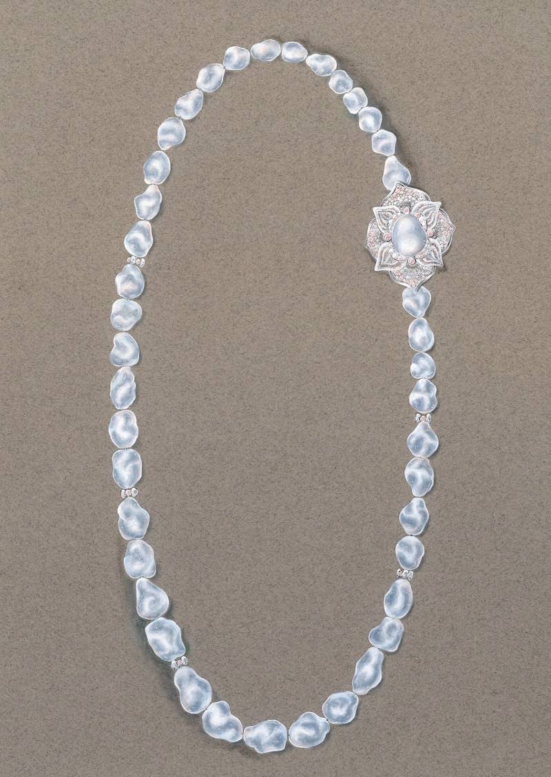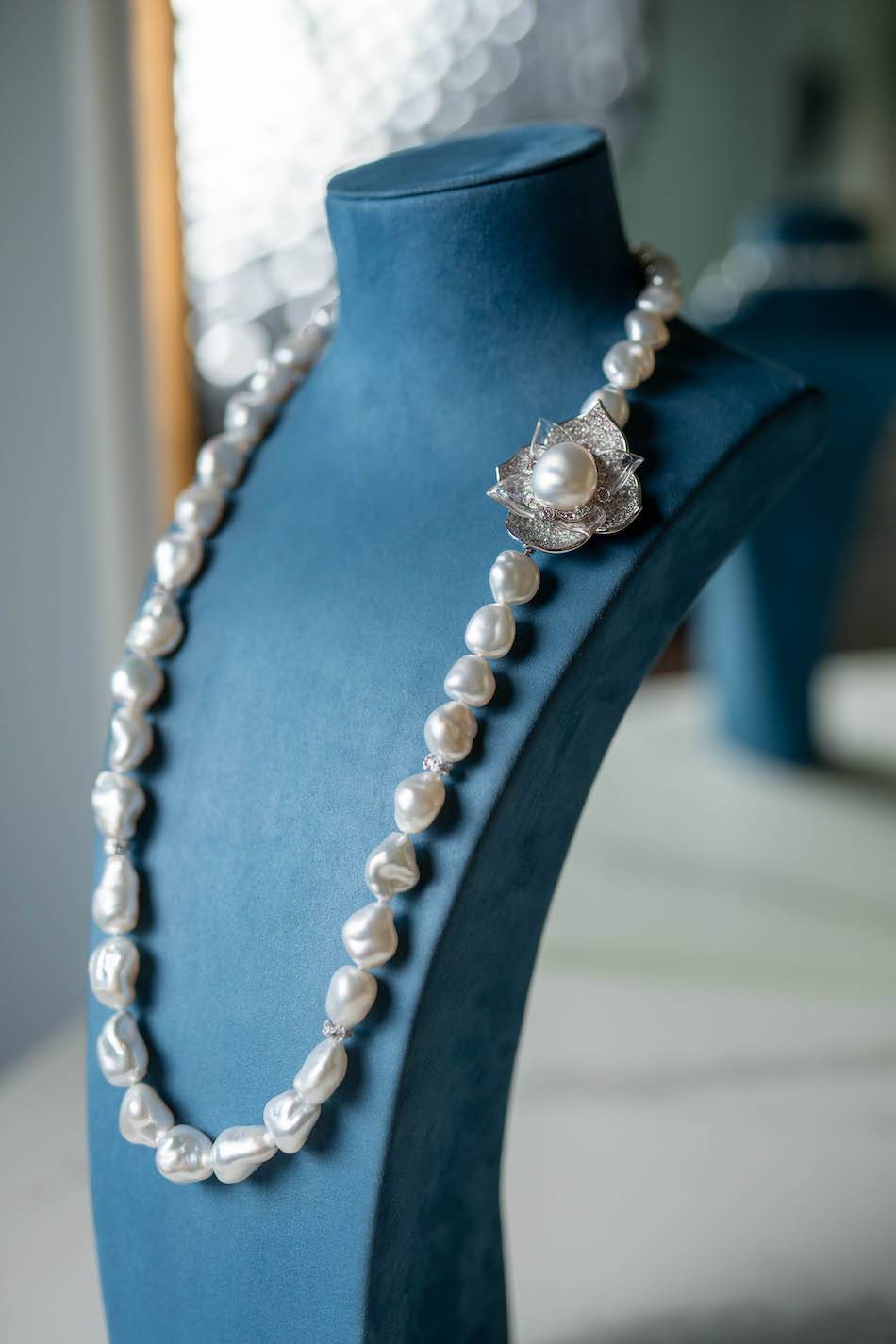 The Keshi pearl strand and individual Keshi in the diamond ‘lotus’ brooch were sourced from off the coast of Broome.