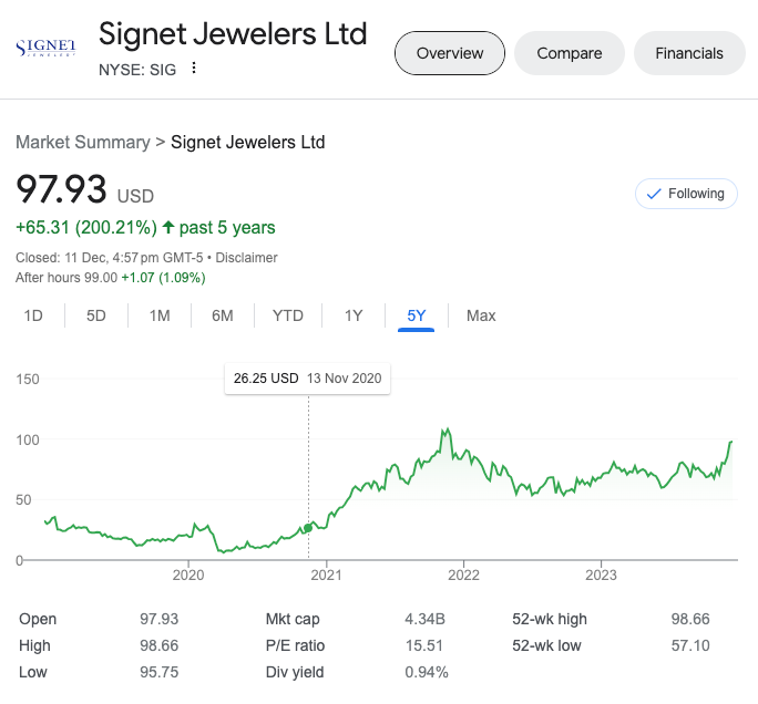 The above is a 5-year review of Signet's share price – despite the difficult last few years of trading it has gone from strength to strength.