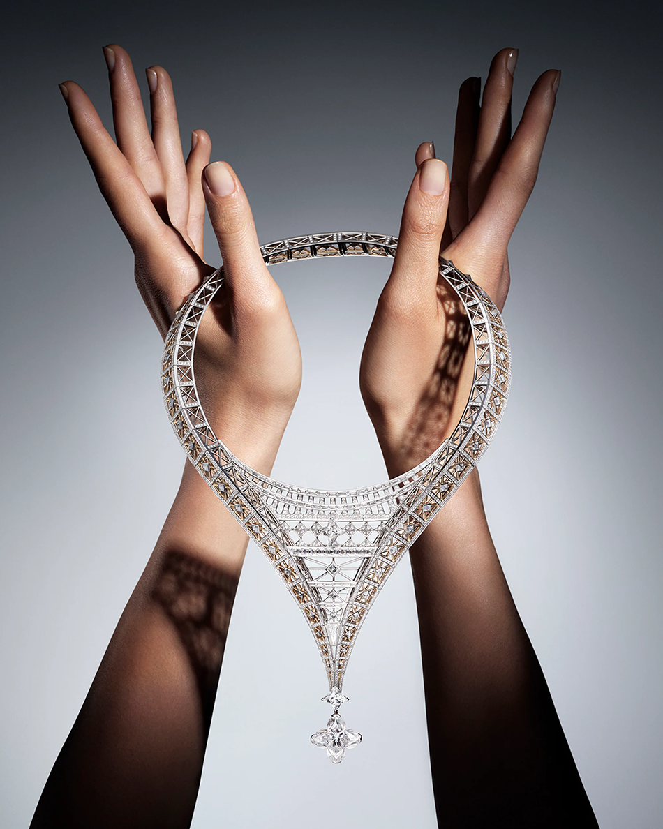 The Victoire necklace, featuring an Eiffel Tower design and a 15.16-carat diamond, cut in the shape of the Monogram Flower.