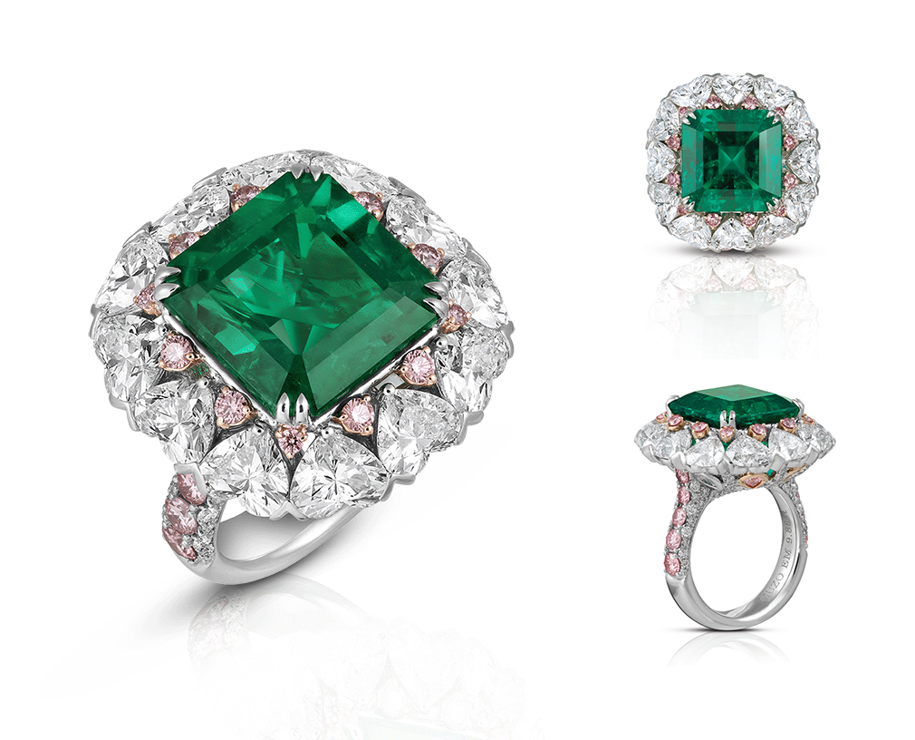 The Angela Rings: The name evokes purity, grace and divinity. An exceptional round brilliant shape no oil Muzo emerald 5.24ct surrounded by 8 heart shape diamonds, total 4.03cts and a bed of 1.69cts of Argyle pink diamonds. Crafted in platinum and 18K gold