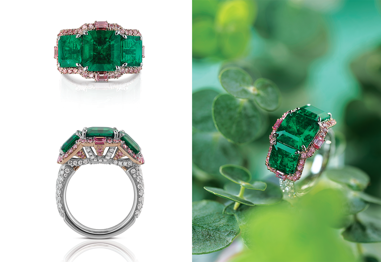 The Viridissima Ring: A feminine name meaning fresh and green. A trinity ring with three emerald-cut Muzo emeralds (cedar oil) totalling 5.72cts outlined by 0.78cts Argyle pink diamonds and 1.06cts white diamonds. Set in platinum and 18K gold