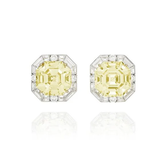 Graff's pair of fancy yellow diamond and diamond earrings weighing 20.33 and 21.38 carats