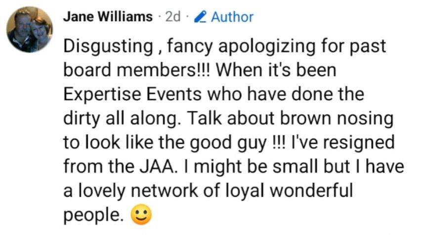 Karen Lindley was appointed to the JAA Board in 2016 after Laura Moore was forced to step down. She recently described the conduct of Expertise Events as "appalling". In 2017, Lindley issued an apology to Expertise Events after she made unfounded allegations.