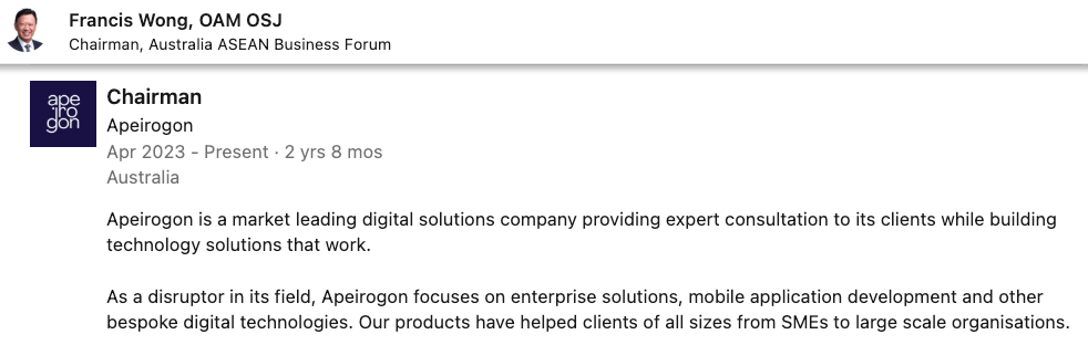 FRANCIS WONG: Promotes himself as ‘Chairman Apeirogon’ - but which ‘Apeirogon’? The one for which he a director and shareholder - and previously with Andy Phanthapangna - or the company that collapsed with $2 million in debts, and owing the ATO $1.1 million.