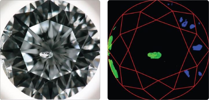 The left image, captured using GIA-developed hardware, trains IBM Research’s artificial intelligence (AI) software to recognise inclusions and reflections of inclusions. In the right image, the AI system has identified inclusions (marked green) as distinct from the blue-marked reflections. The AI