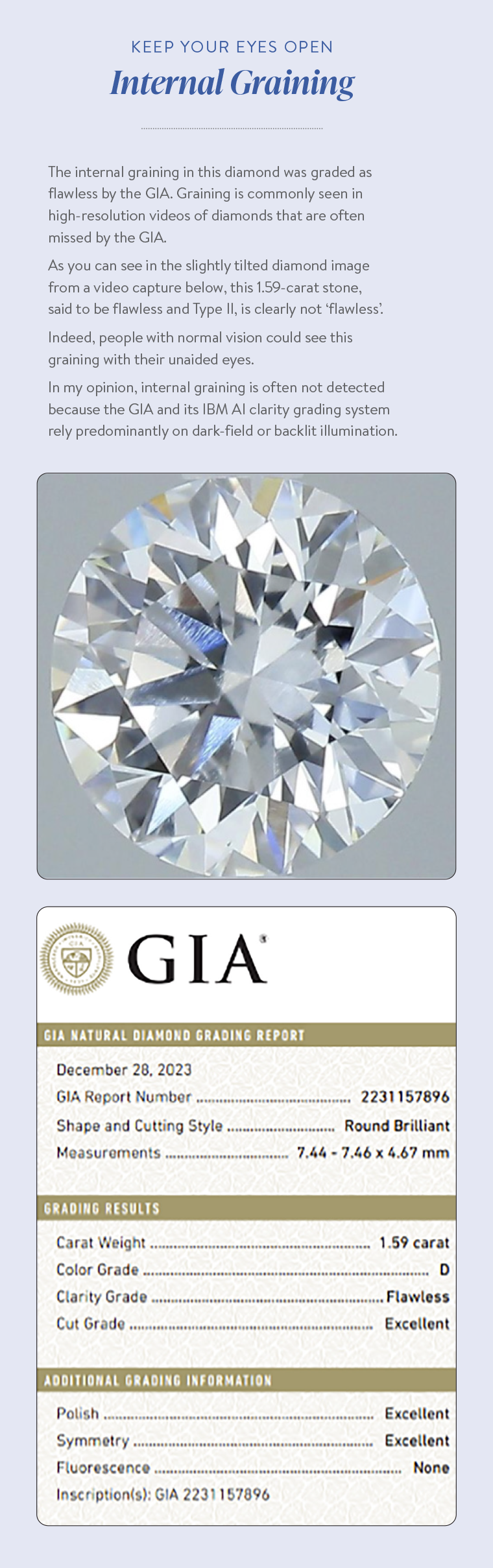 Due to internal graining and clouds, this is a relatively dull diamond that lacks sparkle. Critical factors that would alert consumers and retailers to this fact are not mentioned in the GIA grading report.
