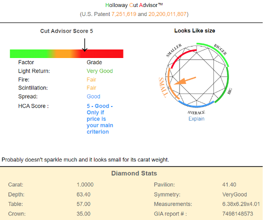 On the Holloway Cut Adviser (HCA) the best cut diamonds score below 2.0 and the worst score 10. The diamond referenced in this article scores HCA 5.0 and is shown to be small for its carat weight.