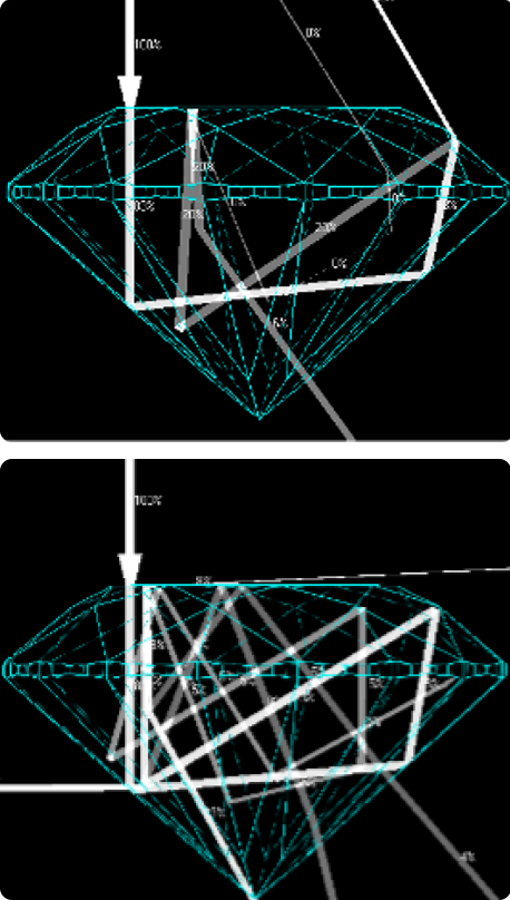 These two DiamCalc ray trace images show an ideal Tolkowsky proportioned model on the top, with most of the ray being returned after two pavilion reflections. In the model at the bottom of the stone discussed in this article, almost all light has completed multiple internal reflections before exitin