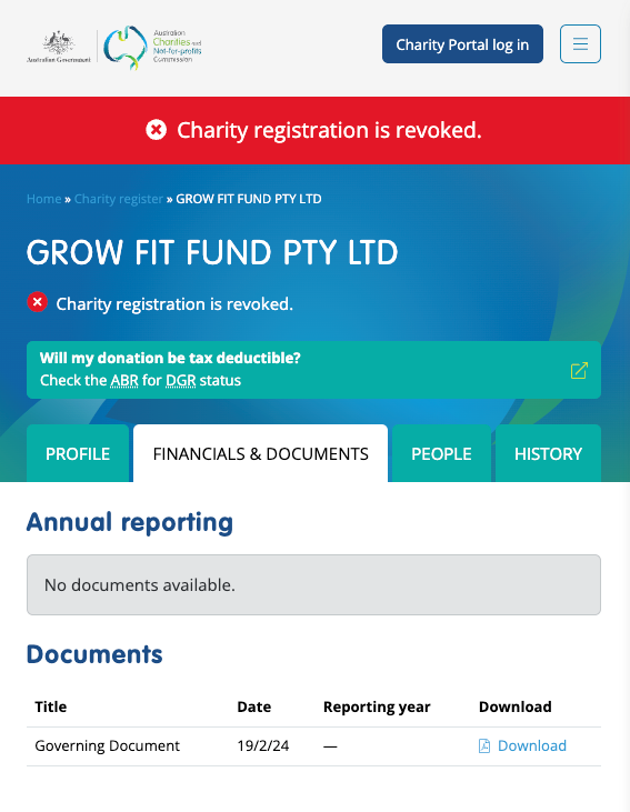 REVOKED - The government regulator revoked the charity registration of Grow Fit Fund following its collapse. It is said to have been insolvent from inception and there is evidence that staff on the Grow Fit Fund payroll were simultaneously employed by other companies associated with the directors.