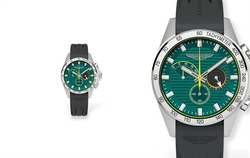 Crafted for precision and presence, the HDL stands out with a 44mm layered recycled stainless steel case and a sleek silver bezel, showcasing a tachymeter scale and three distinct subdials on a dial finished in Aston Martin’s iconic Podium Green.