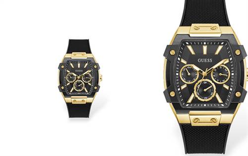 Engineered for bold expression, this GUESS Watch showcases a polished 44mm gold-tone case with a black bio-based nylon overlay.